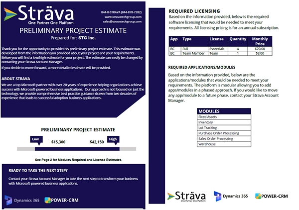 Our 15-minute Business Central Assessment will help you understand the fit/gap and estimated costs to deploy Business Central in your organization. You will receive a personalized estimate including implementation services and licensing as well as the required modules for your project.